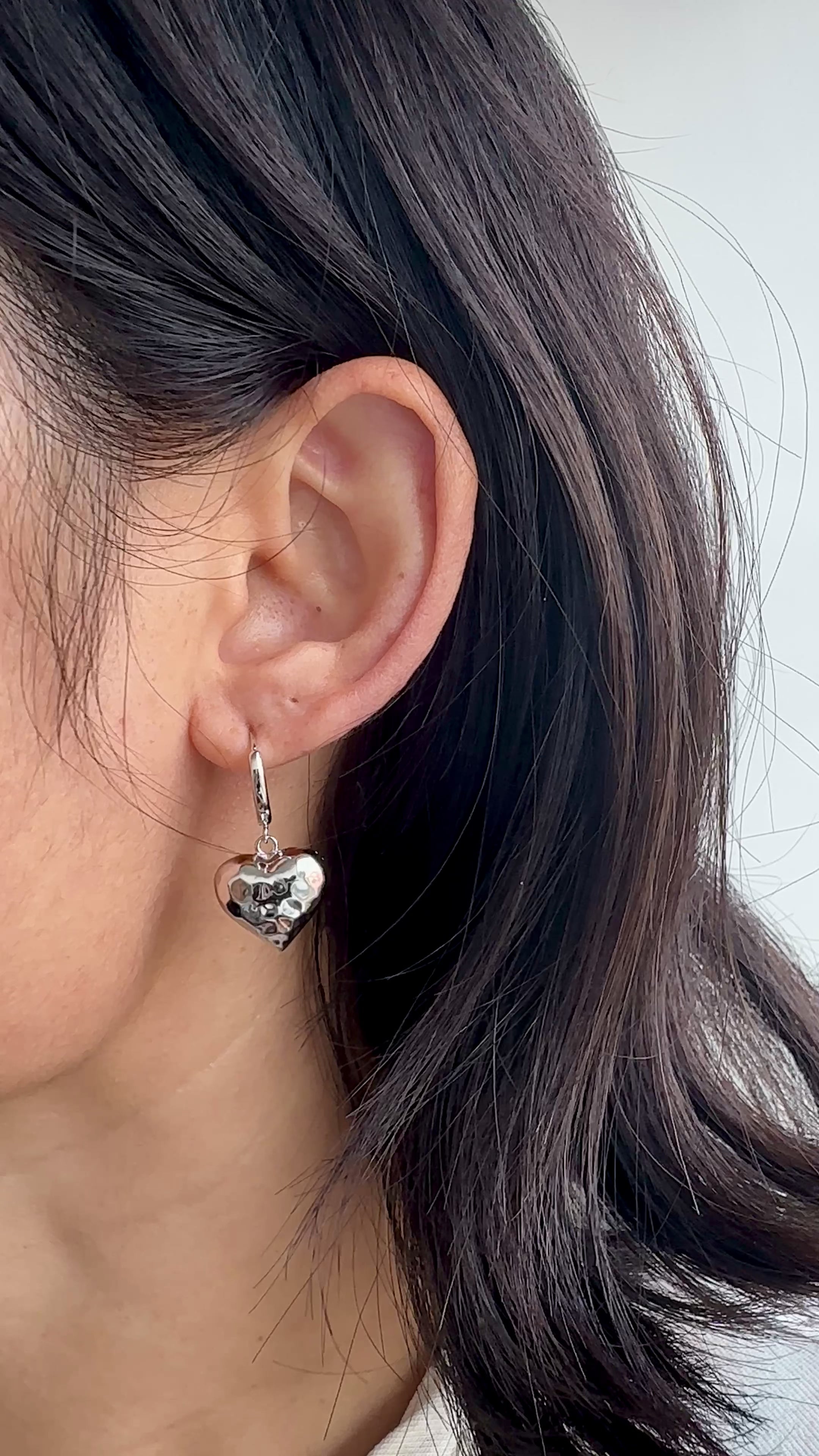 Each earring features a hammered, high-shine heart charm (1.5cm wide) suspended from a secure lever-back clasp for comfort and ease of wear. With an overall length of 3cm, they strike the perfect balance between statement and sophistication.