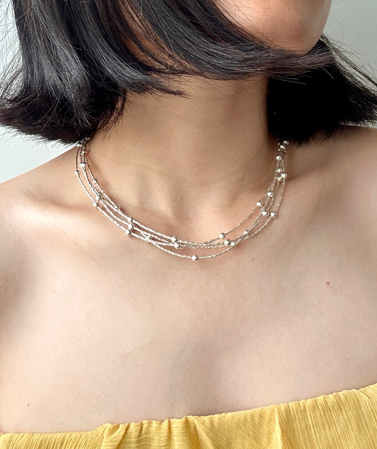 A beautifully handcrafted multi-strand necklace made from premium 925 sterling silver, featuring fine textured chains accented with delicate silver beads. Designed for effortless elegance, this piece layers naturally for a refined yet contemporary look - perfect for everyday styling or special occasions. With an adjustable 40cm chain and 4.5cm extender, it sits comfortably against the neckline and complements both casual and formal outfits with ease.